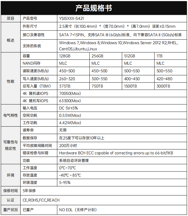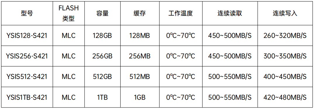YSISXXX-S421產品采用4通道SSD控制器和2D/3D MLC NAND Flash,接口尺寸 為2.5寸SATA。