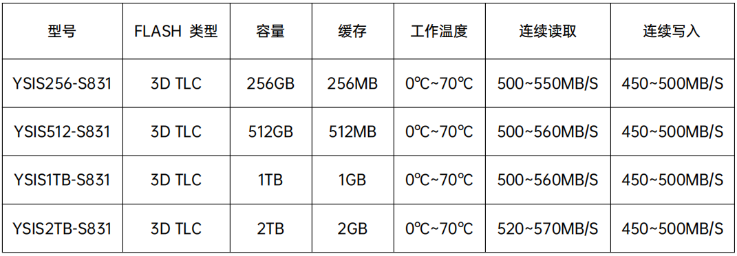 YSISXXX-S831產(chǎn)品采用4通道SSD控制器和3D TLC NAND Flash,接口尺寸為2.5 寸SATA。