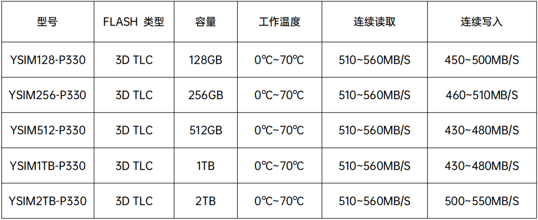 YSIMXXX-P330符合串口ATA I/II/III標(biāo)準(zhǔn)并支持 SATA 3.2協(xié)議。YSIMXXX-P330使用3D TLC NAND Flash。因此,為了保證數(shù)據(jù)的完整性,采用了動(dòng)態(tài)壞塊管理、動(dòng)靜態(tài)磨損平衡、LDPC校驗(yàn)糾錯(cuò)等先進(jìn)的技術(shù)。此外, YSIMXXX-P330的性能遠(yuǎn)超于傳統(tǒng)硬盤(pán)。