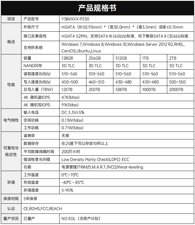 YSIMXXX-P330產(chǎn)品采用2通道SSD控制器和3D NAND Flash,接口尺寸為mSATA, 小巧的尺寸讓該產(chǎn)品可以集成在平臺(tái)內(nèi)。