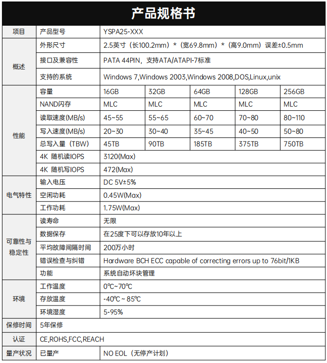 YSPA25-XXX是一款高性能高可靠性的存儲設備,純粹由半導體器件和非易失性 NAND Flash芯片構成,基于NAND Flash技術,解決機械硬盤傳輸速度不高的瓶頸,內部沒有機械部件,解決抗震防跌落的問題。它擁有和機械硬盤完全相同的連接端口,因此可以 完全替換機械硬盤。